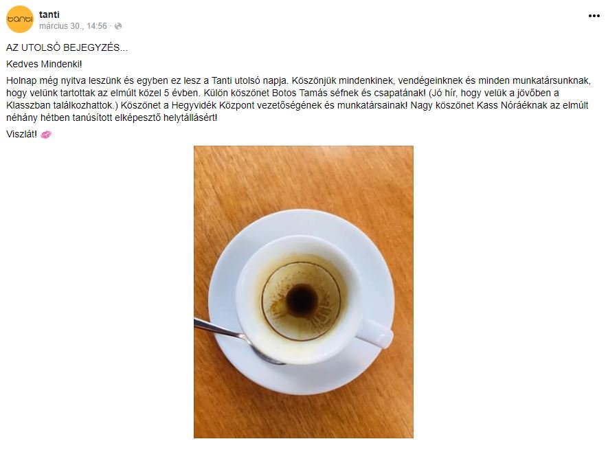 Örökre búcsúznunk kell Magyarország egykori, Michelin-csillagos éttermétől, a Tantitól. A 2015-ben Michelin csillagot szerzett étterem Facebook oldalán jelentette be a hírt még pénteken, tegnap pedig utoljára nyitotta meg kapuit. Közel 5 évig szolgálták ki, a legnagyobb gasztronómiai elismeréshez méltóan vendégeiket.