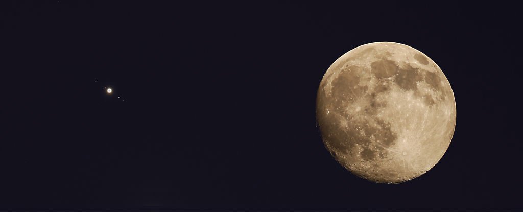 Egy napra rá, tehát május 7-én következik be a Hold-Jupiter együtállás, ami egészen pontosan így fog kinézni. Elképesztő, hogy a Naprendszer legnagyobb bolygója mennyire apró a Föld kísérő holja mellett, igaz? Elképesztő élmény együtt látni őket!