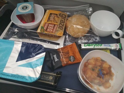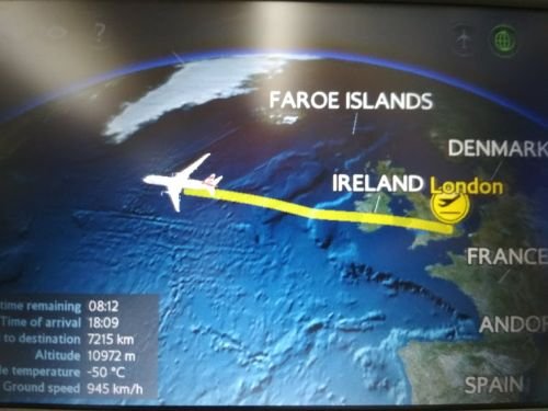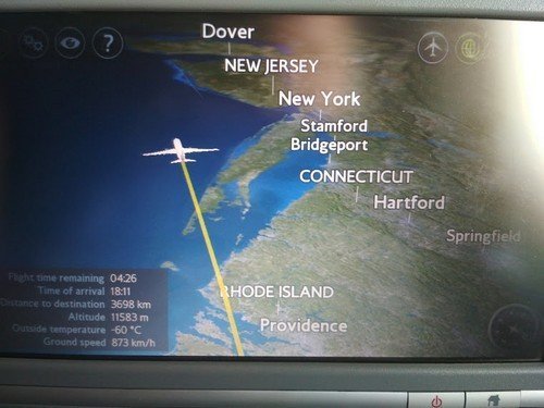 Eltelt egy jópár órácska, most értünk át az óceán másik oldalára,épp Cape Saint John felett suhanunk át olyan 894 km/h-s sebességgel. Megvolt az ebéd, ami igazi repülőgépes, mini adagokban tálalt egyveleg volt. Kétféle főételt kaptunk, az egyik egy sajtmártásos, paradicsomos tészta volt, a másik pedig csirkemell spenóttal és chorizo mártással, steak burgonyával. Azért egyértelműen a második volt a finomabb, de a tészta sem volt rossz. Mellé még kaptunk egy adag salsát is, amihez volt valami kis ropogós, majd a tálcára oda volt zsufizva egy kukorica ropogtatós, desszertnek pedig sós, karamellás csokoládés szösszenetet kaptunk - vagyis elég komplett volt a kaja. Na nem mondom, hogy kényelmesen falatoztunk, de nem is a fine diningról szól ez az út. Az égbolt közben klasszul kitisztult, ha már Londonból nem láthattunk semmit, akkor legalább az észak amerikai kontinens megmutatja jeges és szikrázó partjait. Ha net közelébe kerülök, akkor majd pakolok ide egy pár fotót, bár az úgysem adja ki az igazi látványt. Annyiban jó, hogy már végre szárazföldet látunk, de szomorú hír, hogy 5 óra 30 perc van landolásig, vagyis kvázi az út felén vagyunk túl. Nos visszatérek a tetrisre, a flipperre és az egyéb játékokra, aztán majdcsak eltelik az idő.