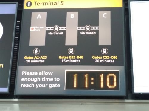 A becsekkolás és a biztonsági ellenőrzés a szokásos módon ment - vagyis engem simán átengedtek, Esztert pedig alaposan megmotozták... :-) Ami tök érdekes volt, az a repülőn szóló komolyzenei aláfestés, ami számunkra olyan igazi brit megoldásnak tűnt. Az is fura volt, hogy csinos sztyuvi lányokra számítottam - ehhez képest fess brit csávók fogadtak bennünket. A gép egy Airbus A320 jet volt, és hasonlóan a fapadosokhoz, fizetősen lehetett fogyasztani. A landolás Heathrow 3-as Terminálján történt, majd nekünk át kellett menni az 5-ösre. Ez így egyszerűnek tűnik, még akkor is, amikor tudjuk, hogy ez a reptér nagy.