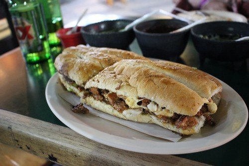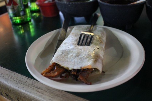 A lényeg az, hogy beültünk egy szimpatikus helyre, a teraszra, majd helyből kértem két tequillát - már csak a fertőtlenítés miatt is. Erre azt mondja a menyecske, hogy olyanjuk nincs - igyunk sört. Ezen kis liezonon kívül le a kalappal előttük, mert olyan kaját hoztak, hogy csak na. Bemelegítőnek én kértem pastor burritot, Eszter pedig casadilla-val nyitott. Az első rendelésénél én jobban jártam, Esztié sem volt rossz, de otthon legalább ilyen csinálunk mi is. Jelzem, én nem vagyok oda a csípős, erős ételekért, de a chili és jalapeno hazájában én is kenegettem a burritót mindenféle jóval. A bemelegítés után szívem választottja szintén egy burritóra szavazott, én taco-ban gondolkodtam - mikor a szomszéd asztalhoz gyönyörű szendvics szerű, húsos ételeket hoztak, amit rögtön én is megrendeltem. A kaja neve tortas, amit tésztának lehetne talán fordítani. Na ez volt a csúcs. Szálas, sült sertéscsíkok, zöldségek, hagyma és ki tudja még mi, na meg a chili és jalapeno. A végére ki is fogott rajtam, szégyen szemre egy kicsit ott is kellet hagynom. Utána azért csúszott a mexikói sör, kicsit még mászkáltunk, buszoztunk - aztán most "itthon" pihegünk.