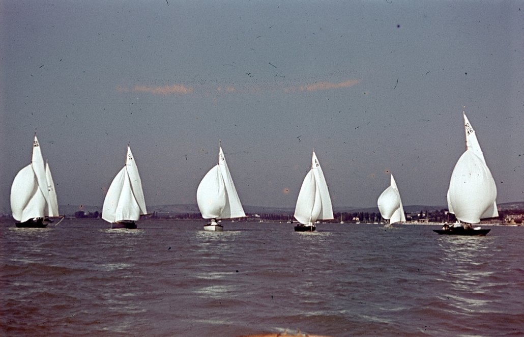 Fortepan / Dr. Ember Károly 1941-es fotó egy 30-as cirkálóról a siófoki belső kikötőben, valószínűleg a Bohó nevű hajóról. A mentőöv alapján látszik, hogy a Bohó egy rendszeres résztvevője volt a Kékszalag versenyeknek. Fortepan / Dr. Ember Károly 1941-ben, Balatonfüred közelében megrendezett Kékszalag vitorlásverseny. Az esemény eredeti versenykiírása 1934-ből származik, és így fogalmaz: "Egy 140-160 km-es navigációs verseny - a partok érintése nélkül - nagy figyelmet, hajós felkészültséget, vitorlázó tudást és egész embert kíván." Fortepan / Somlai Tibor 1936-ban vitorláshajók felvonulása Tihanyban, a Magyar Tudományos Akadémia Balatoni Limnológiai Intézete előtt. Fortepan / Dr. Ember Károly Vitorlás 1943-ból. Fortepan / Dr. Tóth Károly 1962-ben egy kalóz látható a Tihanyi Apátság épületének háttérben. A német Carl Martens tervei alapján épített, stabil, tágas és könnyen karbantartható modell gyorsan terjedt el. Magyarországon 1942-ben rendezték az első kalózbajnokságot. Fortepan Reggeli rutin a siófoki vitorláskikötőben 1959-ben, a háttérben egy vas 50-es cirkáló. Fortepan / Mészáros Zoltán Kilátás a siófoki Európa szállóból (1968). Fortepan / MHSZ Tihany, Gödrös: korabeli modellvitorlások 1964-ben. Fortepan / Umann Kornél 1979-ben a Balatonon való hajózás az Uránusz nagyvitorláson. A kétárbócos, közel 16 méter hosszú vitorlás a Balatonfüredi Hajógyárban készült 1955-ben, utasbefogadó képessége 31 fő volt. Háttérben a legendás Beloiannisz motoros hajó látható. Az Uránuszt 2007-ben, a Beloianniszt pedig 2003-ban vonták ki üzemeltetésből. Fortepan / Dr. Ember Károly Balatoni idill egy 50-es cirkálón.